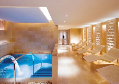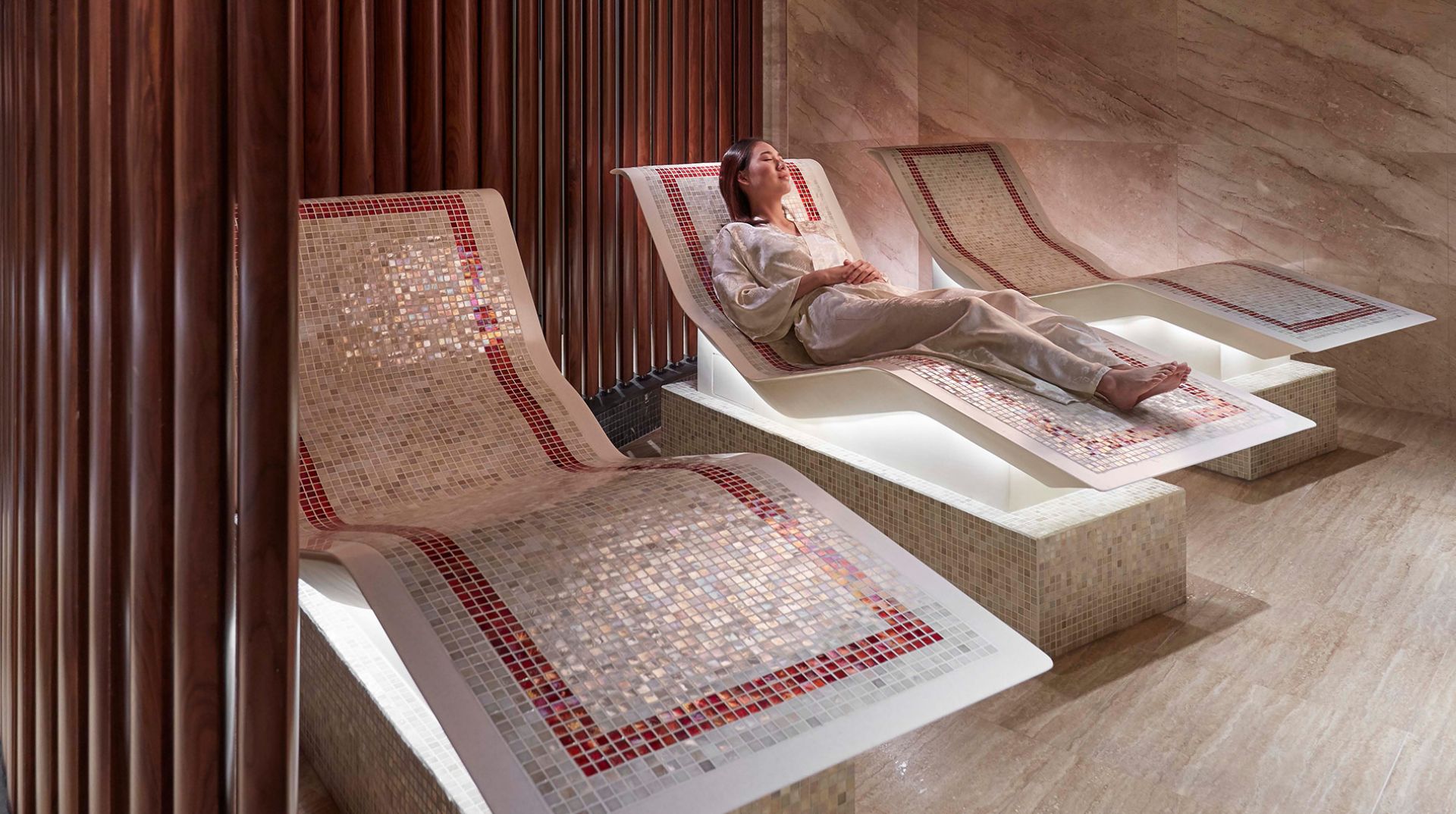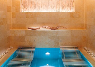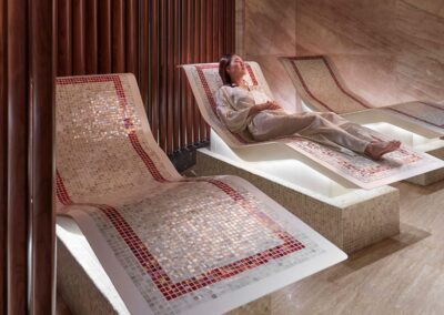 A relaxation area lets guests wait while physically and mentally transitioning between the outside world and the spa’s interiors. The steam room entices with its herbal-infused scent, while the dry-heat sauna lets guests sweat it out. A break at the tepidarium can lead to a refreshing rain shower to cleanse and prepare for the treatments ahead.