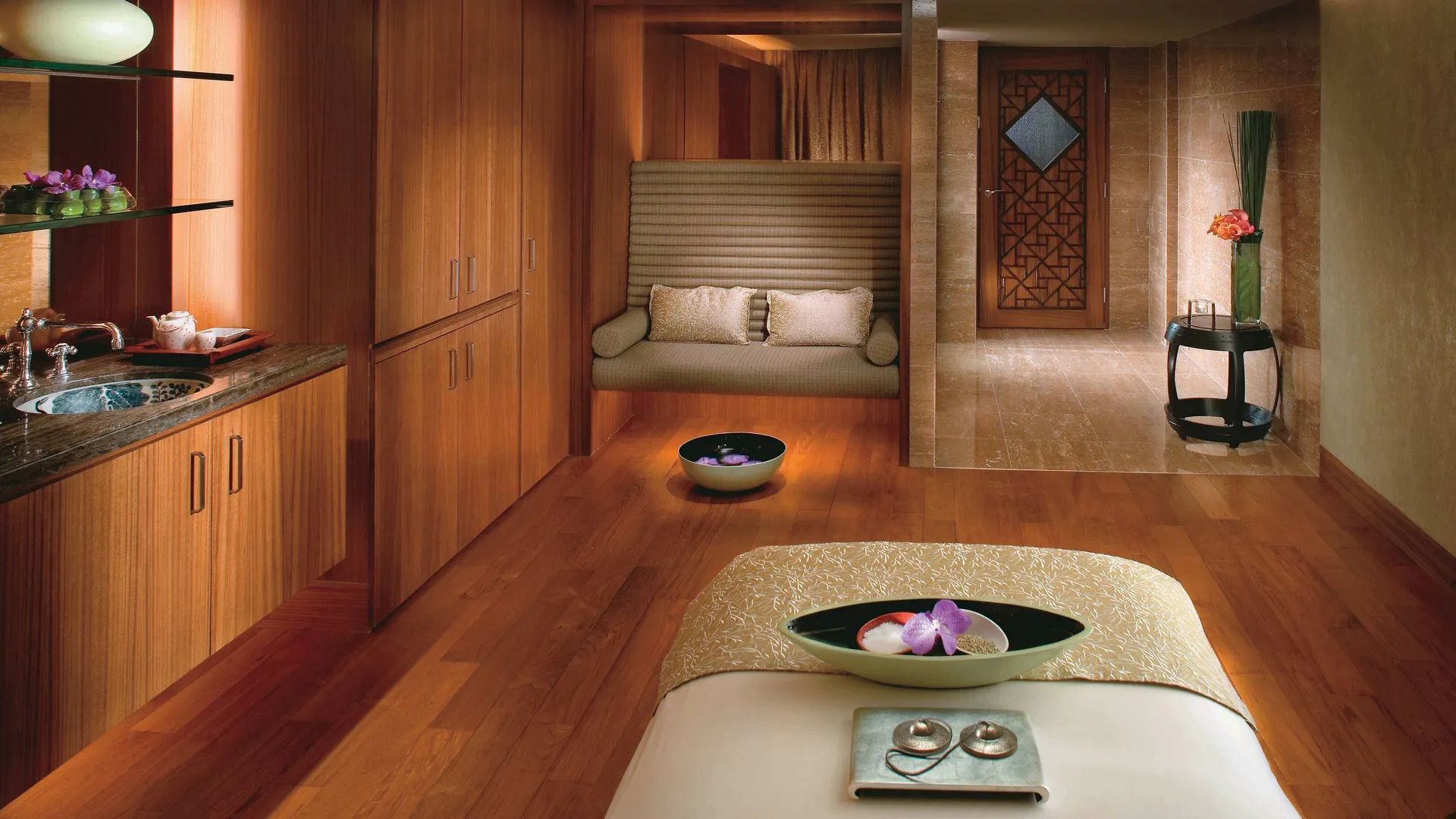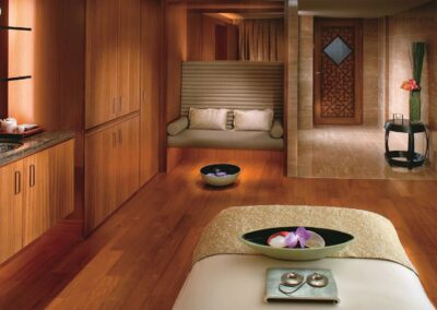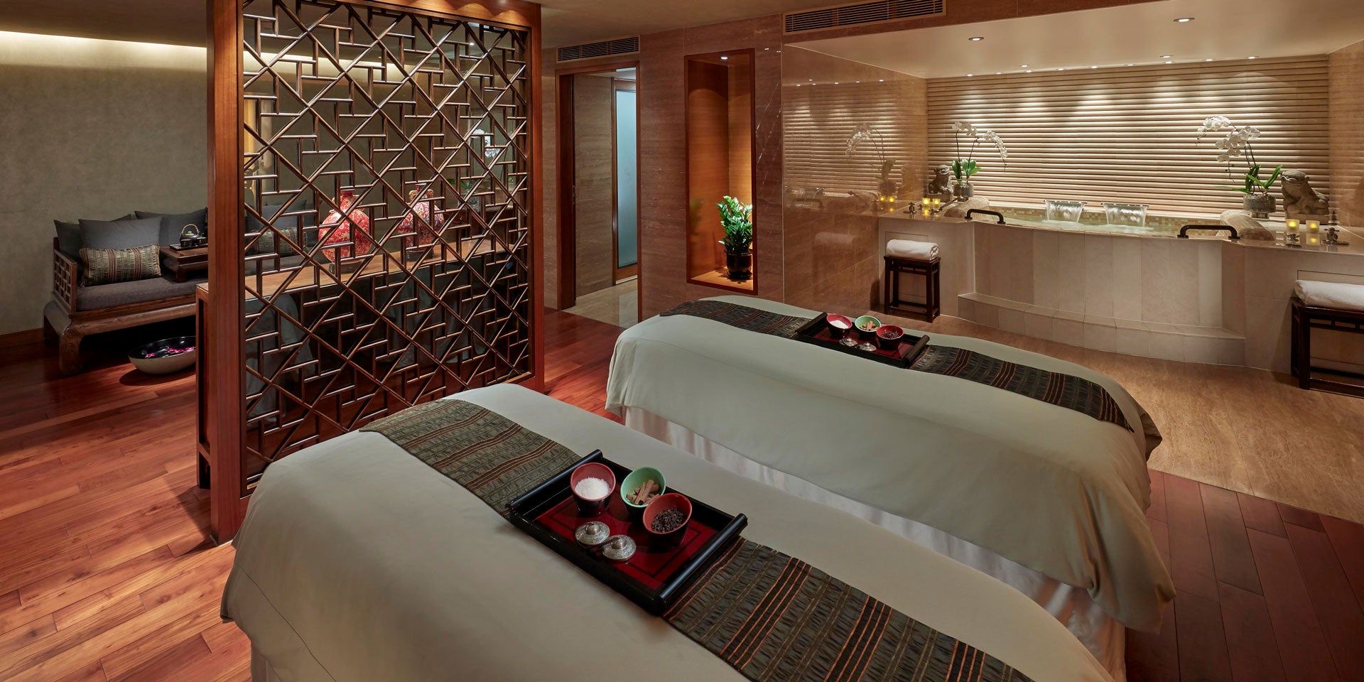 The treatment rooms at The Mandarin Spa are separated by wooden panels, with comfortable cushioned tables where therapists can treat guests. Couples can also book treatment suites as part of the spa’s special packages.