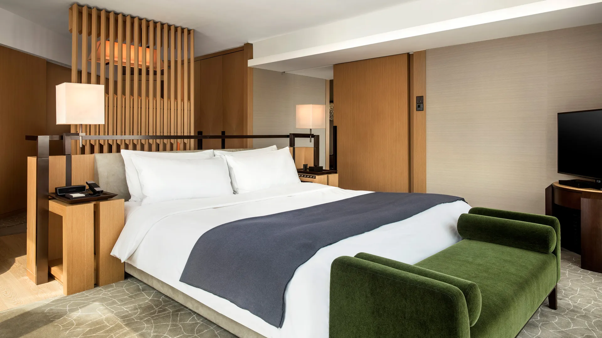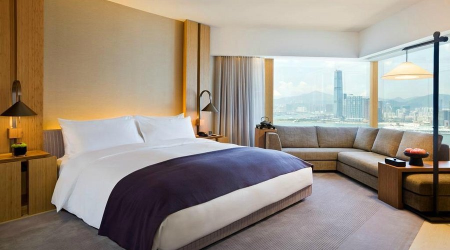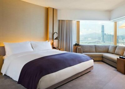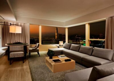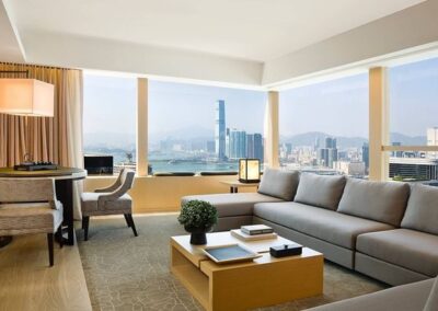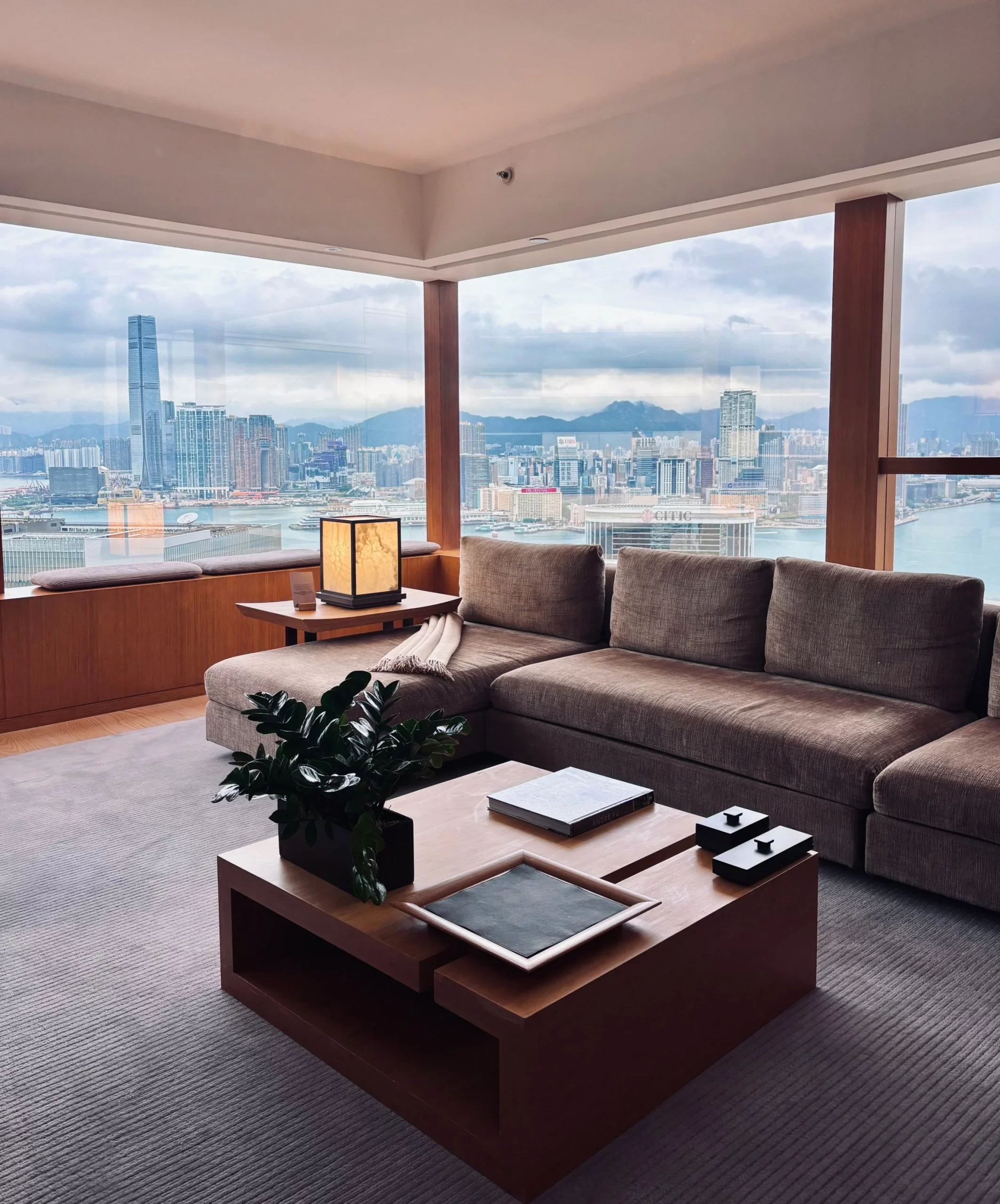 Each of the hotel’s 117 spacious rooms start at 730 sq ft, the largest in Hong Kong. They feature bespoke natural materials, calming color palettes, and stunning views of Victoria Harbour or the city skyline, all designed to feel like a private residence rather than a typical hotel room.