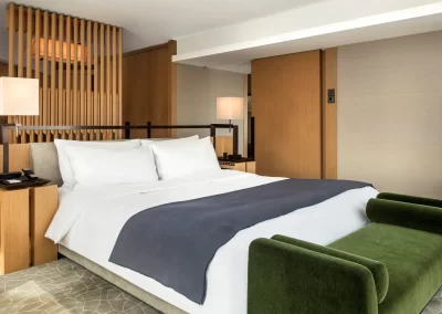 Finally, the Andre Fu Suite serves as both luxurious accommodation and intimate event space, with up to 182 square meters of floor space, a dining table for up to 18 guests, and furniture and tableware from the architect-designer’s own signature line. Twin massage beds occupy the spa area, while the suite’s lone king bed is adorned with down bedding.